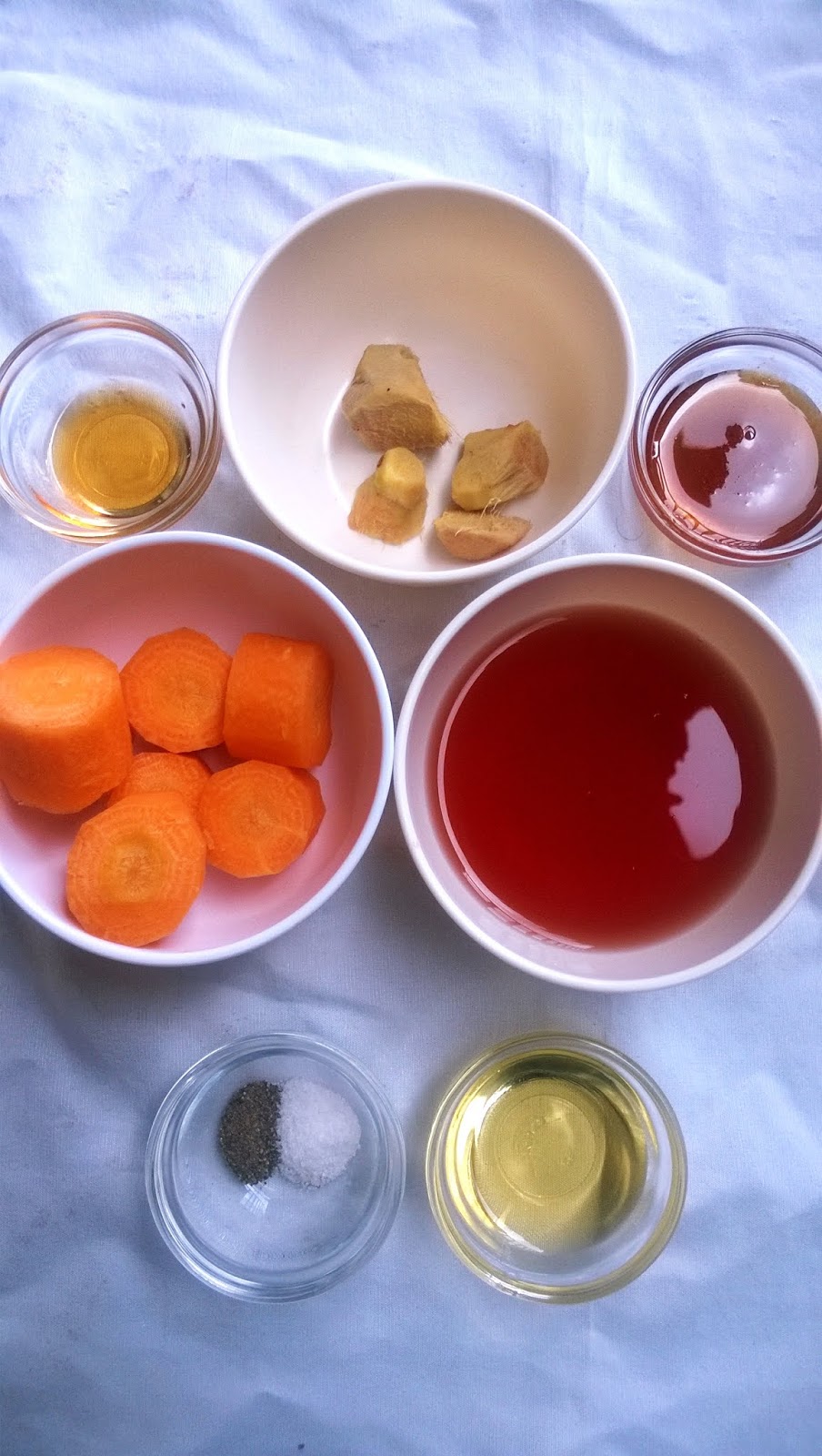 - Add Carrot, Red Wine Vinegar, Honey, Vegetable Oil, Fresh Ginger, Sesame Oil, Salt and Black Pepper in a blender